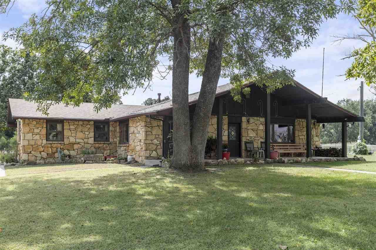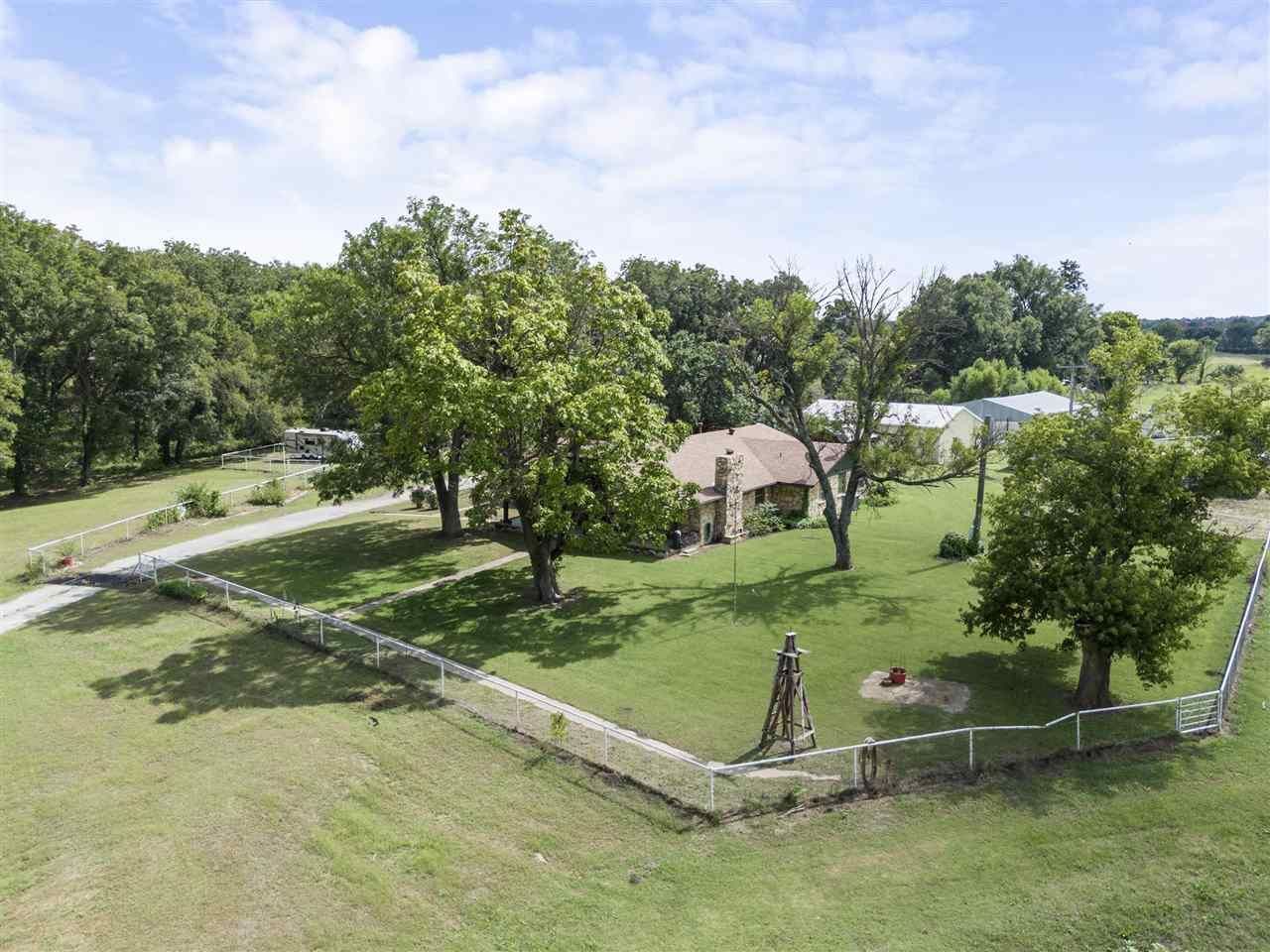 Stop searching and start living the ranch life youve always dreamed of. From sunrise rides to evening roping sessions, this isnt just a home?its a legacy. Spanning 77 fenced acres, this property is a true haven for horse enthusiasts and cattle ranchers alike. Fully equipped for action, the ranch features roping arena, tack room, horse stalls, and a pole/equipment barn and 32 x 48 shop. Whether youre working livestock in the pastures or enjoying a quiet sunset this is the perfect property for you! A small pond on property, trees, wildlife from turkey to deer in the area. The heart of the property is a stunning 2,600+ sq. ft. home designed for gathering. The massive chefs kitchen flows seamlessly into the open living and dining areas, anchored by a stone fireplace perfect for hosting lg. parties! The kitchen also opens to a bonus den/office. The primary bedroom is lg enough for sitting area and has ensuite bath. Additional 2 spacious bedrooms share full bathroom. For convenience is 1/2 bath. Attached oversized 2 car garage, several outbuildings, storm shelter and much more!!!!